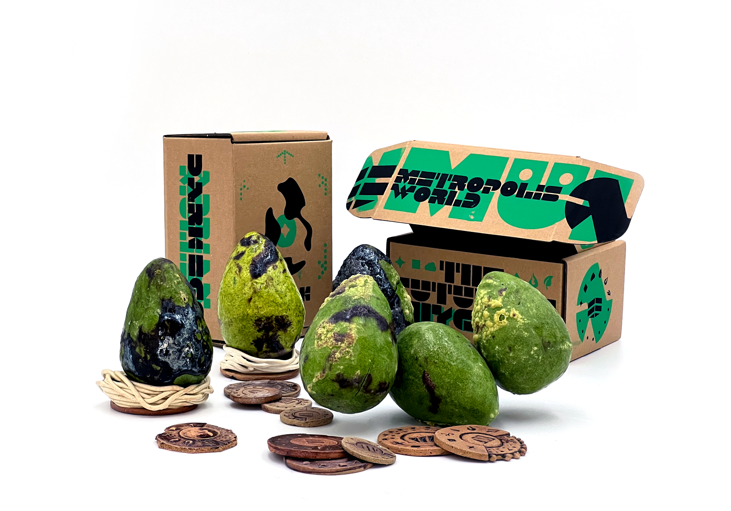 Hidden inside each egg is a single ceramic coin; the first issue of the Metropolis World clay token, made from red stoneware.
